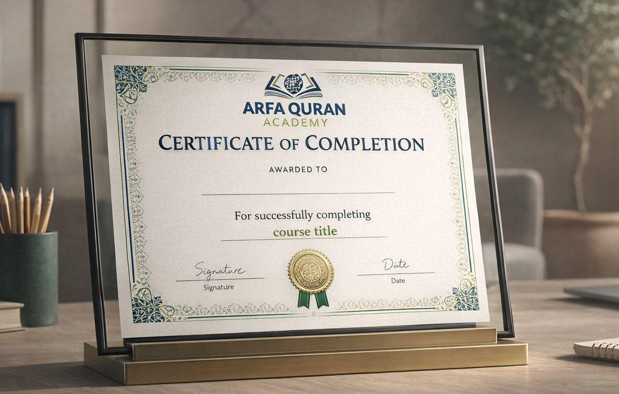 Alhamdulillah! Upon successfully completing the course, students are awarded an official certificate that recognizes their hard work, commitment, and progress in Quran learning. This certificate highlights their achievement, discipline, and growing connection with the Quran. It represents a meaningful milestone in their journey of recitation, understanding, or memorization. We pray that Allah blesses them with continued growth, success, and barakah in their learning ahead.